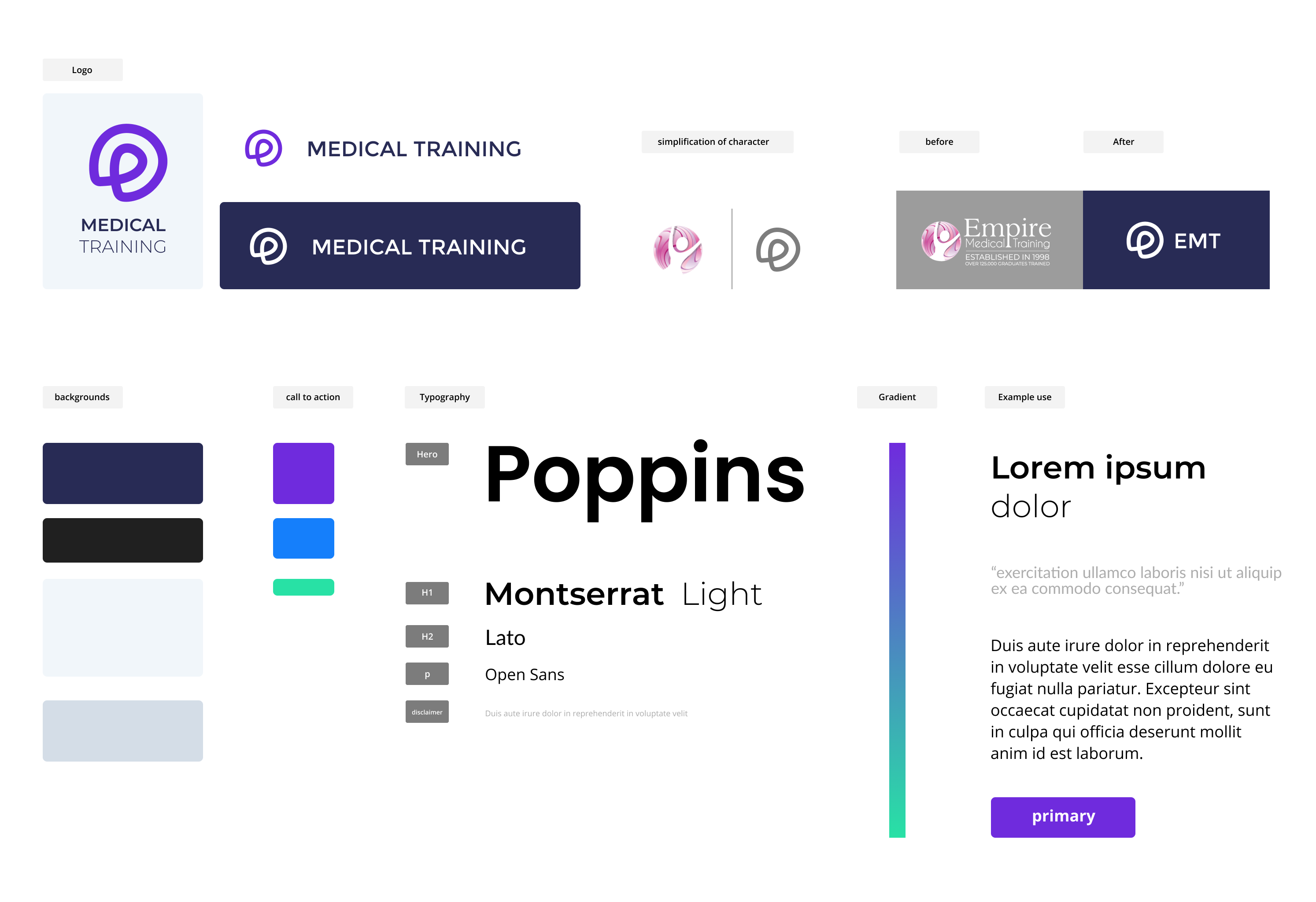 Here I took the time to come with a graphic to explain the overall look and feel of the site, we defined the Fonts, weights, and unique style (in this case the combination of Montserrat Semibold with the last Word in light), and we defined the Coloraturas use, background, alternative background, primary, secondary, disabled.. etc.